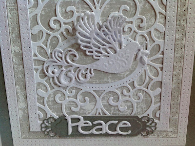 I have used the same Copenhagen background die within the frame, but didn't glitter through this one. My main focal element is the dove from Sue Wilson's Festive Collection - Dove of Peace. I double cut this to build up the wings. I have also used the Peace sentiment from the same set, cut in glitter cardstock to match the dove, and mounted onto a Spellbinders tag. The patterned paper is from the Silent Night Collection by First Edition Papers, Trimcraft.